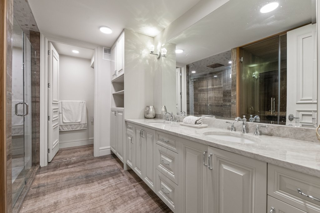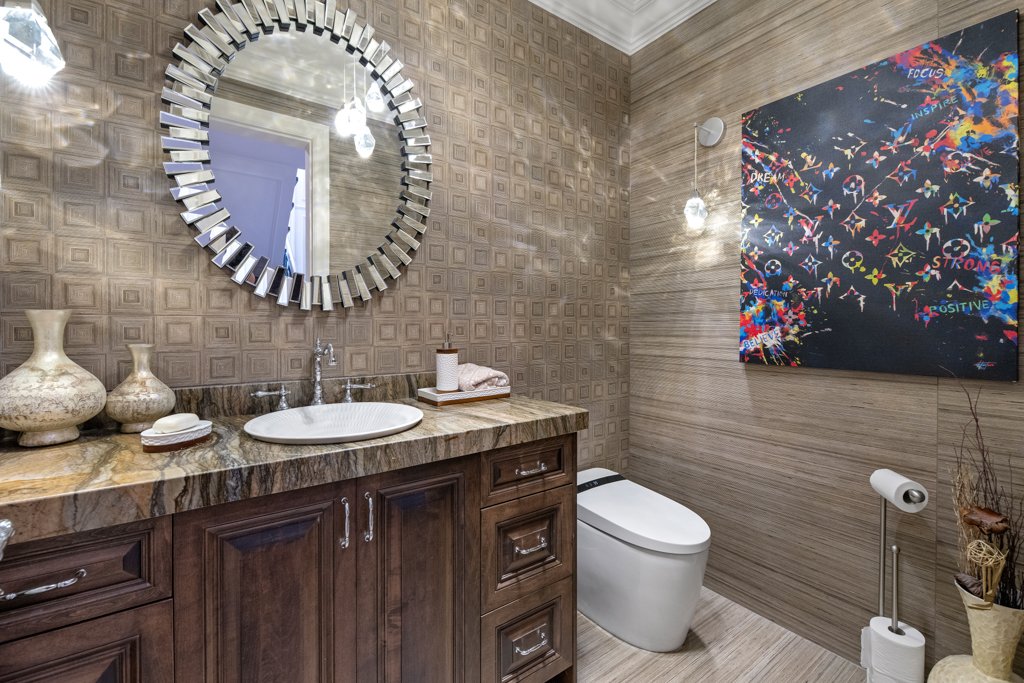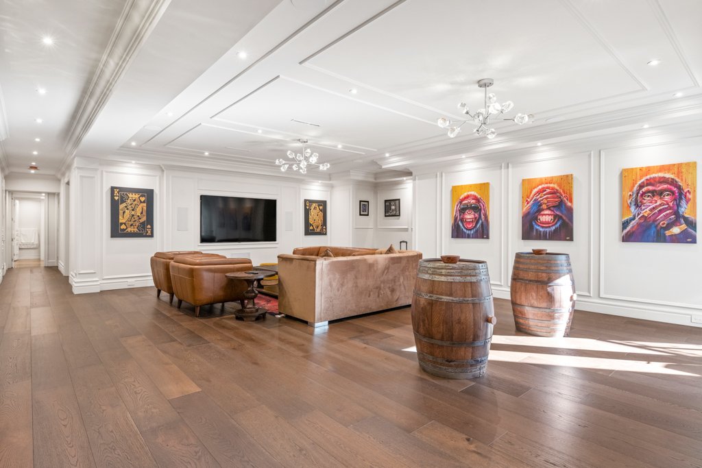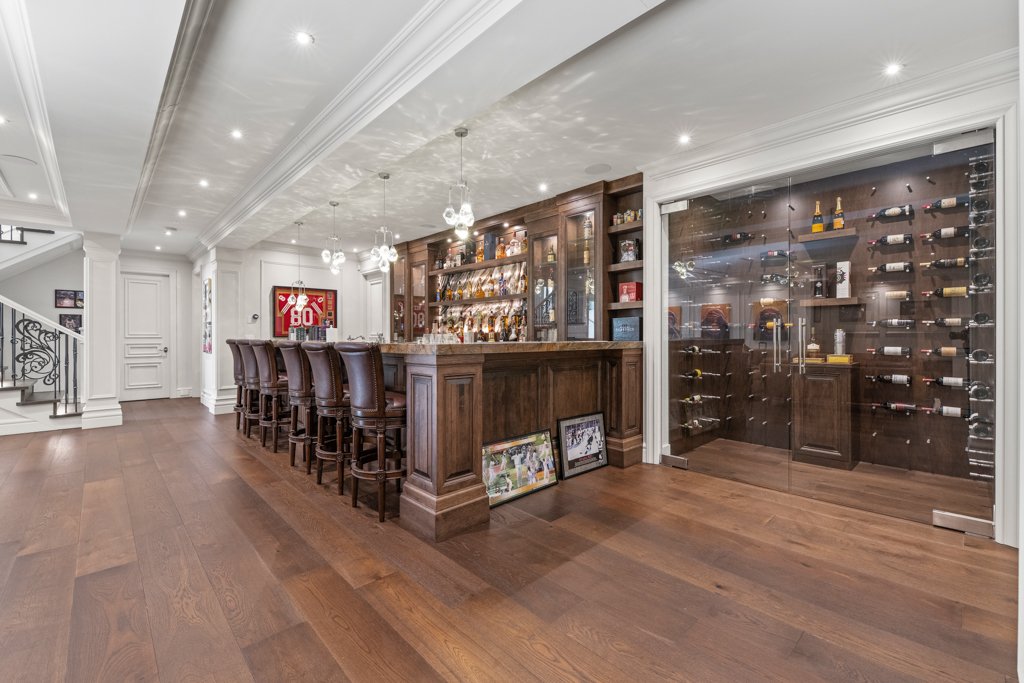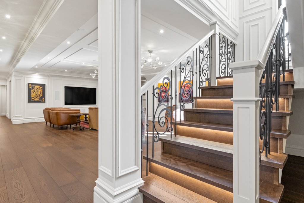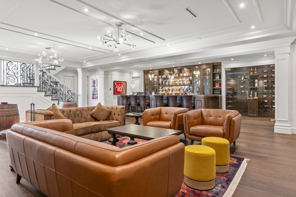 The lower level is an entertainer’s dream—designed for both relaxation and hosting—featuring a large bar area, spacious recreation room, living lounge, media/theatre room, private gym, and sauna. The basement also includes a full-size bedroom with a nanny/in-law suite, complete with a separate entrance, making it ideal for extended family or guests.